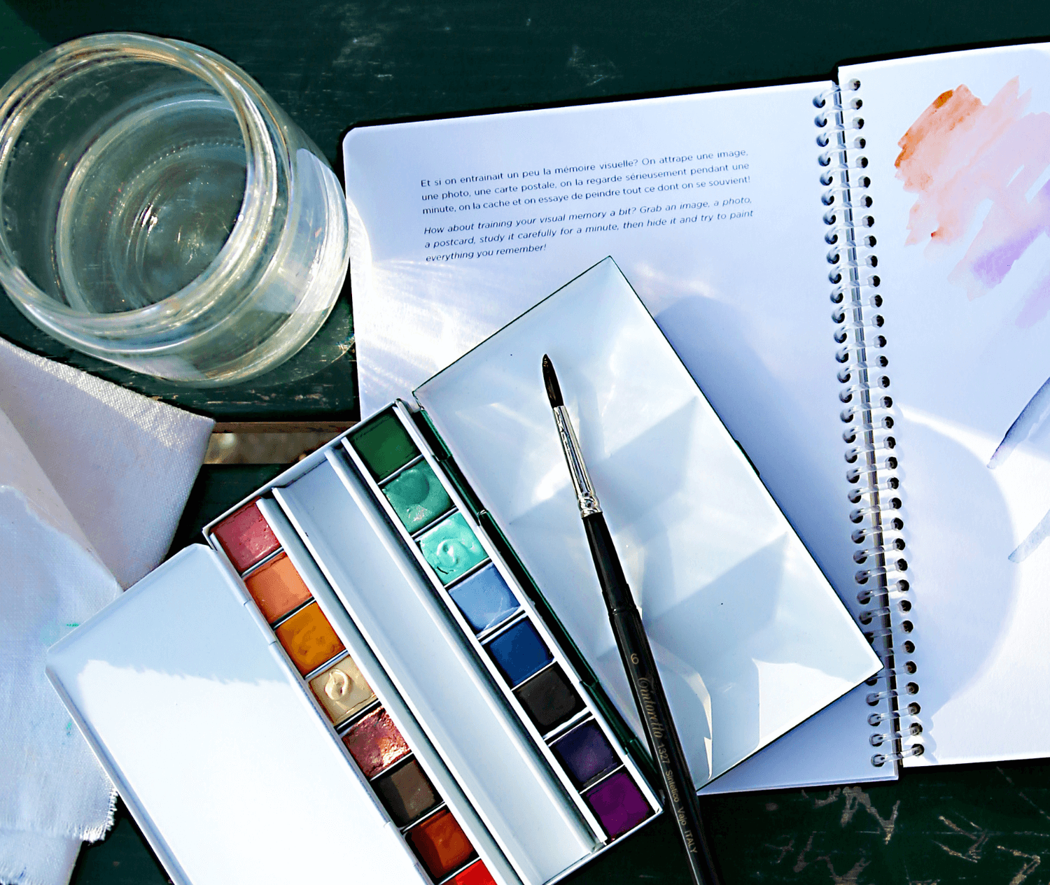 Nous chassons l'inutile: le surplus d'aquarelle devient échantillon, le furoshiki chiffon à pinceau.